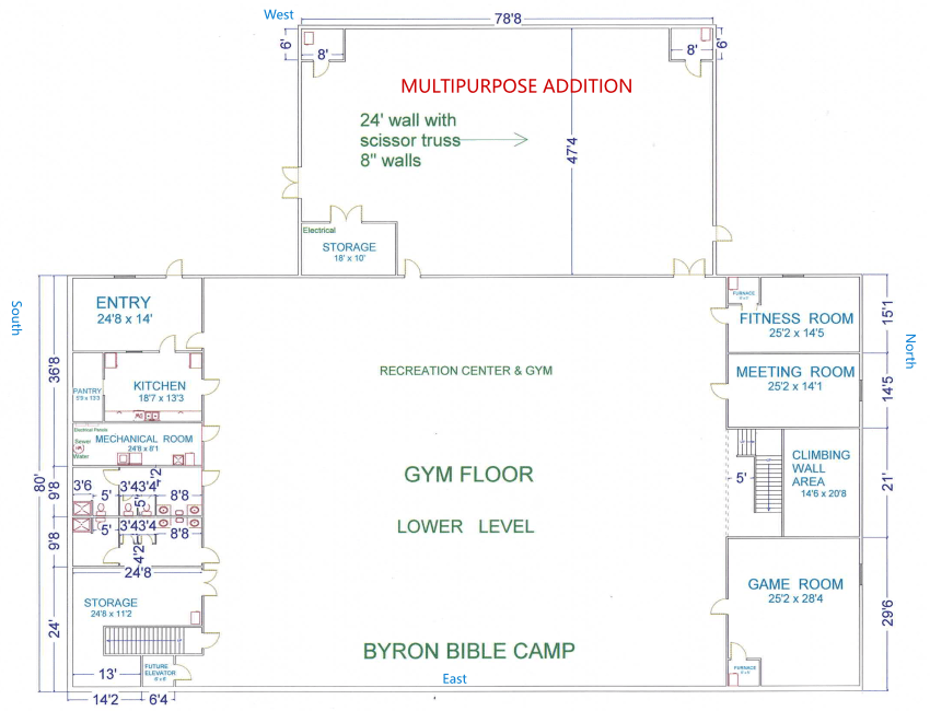 We are excited to announce the board’s decision to build onto the existing Gym here at BBC. Because of how God has brought camp growth we feel an additional indoor multi-purpose space is a wise thing to build. This addition will allow us to set up the activities listed below. We currently have the equipment and resources for these activities, but we are lacking the indoor space for them.